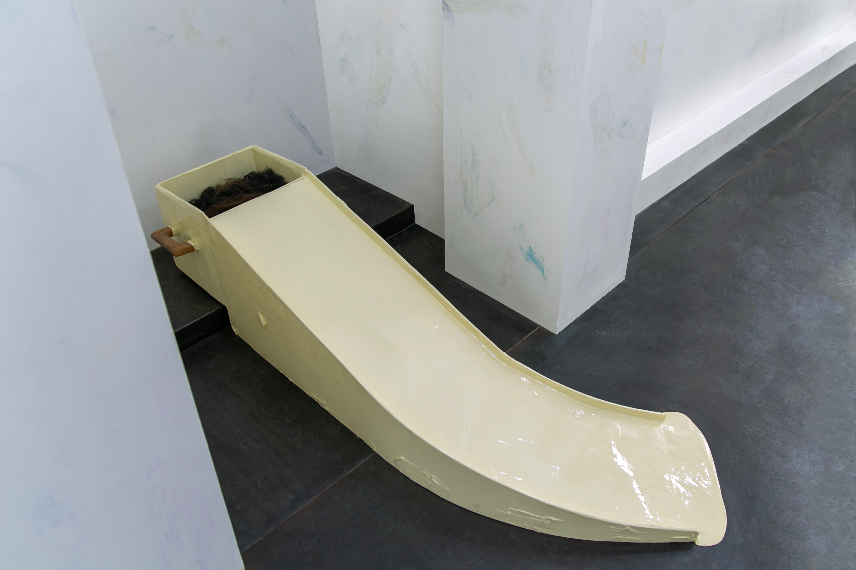 nūbēs by Raphaël Lecoquierre is an in-situ work in the form of an abstract fresco that stretches the length of the exhibition space. It was created from a collection of silver gelatin photographs found and then obliterated by an oxidation process. While the images dissolved, the artist extracted the coloured substances from them and incorporated the pigments into a stucco surface applied to the wall. The images documenting the world have disappeared and are renewed as interwoven abstract patterns on a nebular, ethereal pictorial surface.