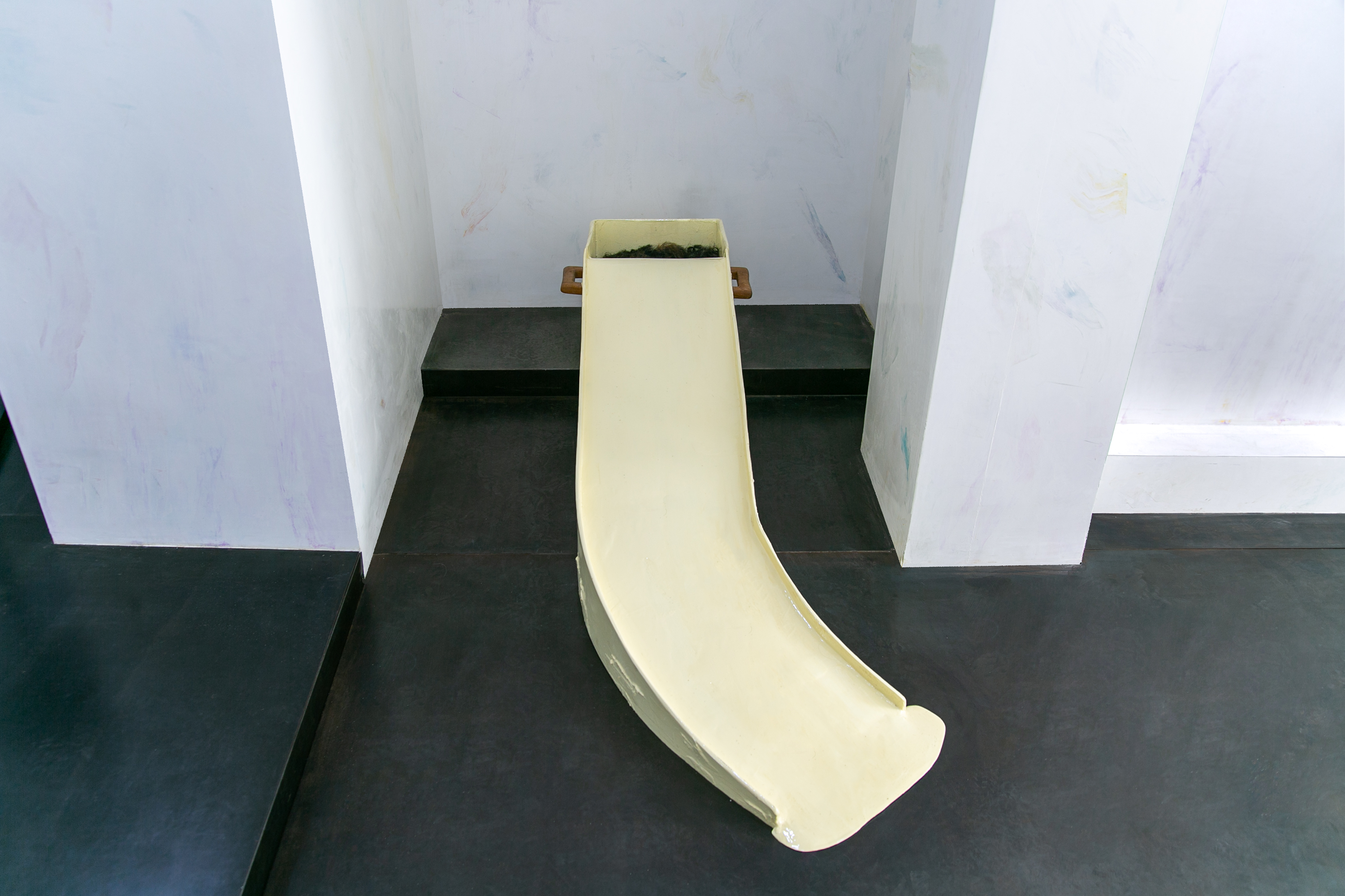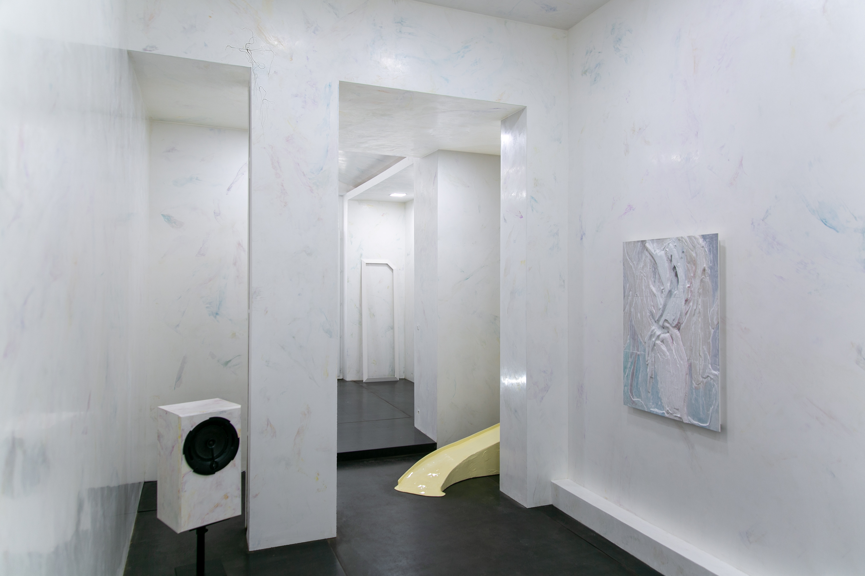 For the duration of the exhibition, five artists will be invited to take part successively in the installation by exhibiting their own sculptural, sonic, or painted works, which will interact with the fresco, while taking into account the inherent specificities of the Espace Moss project.