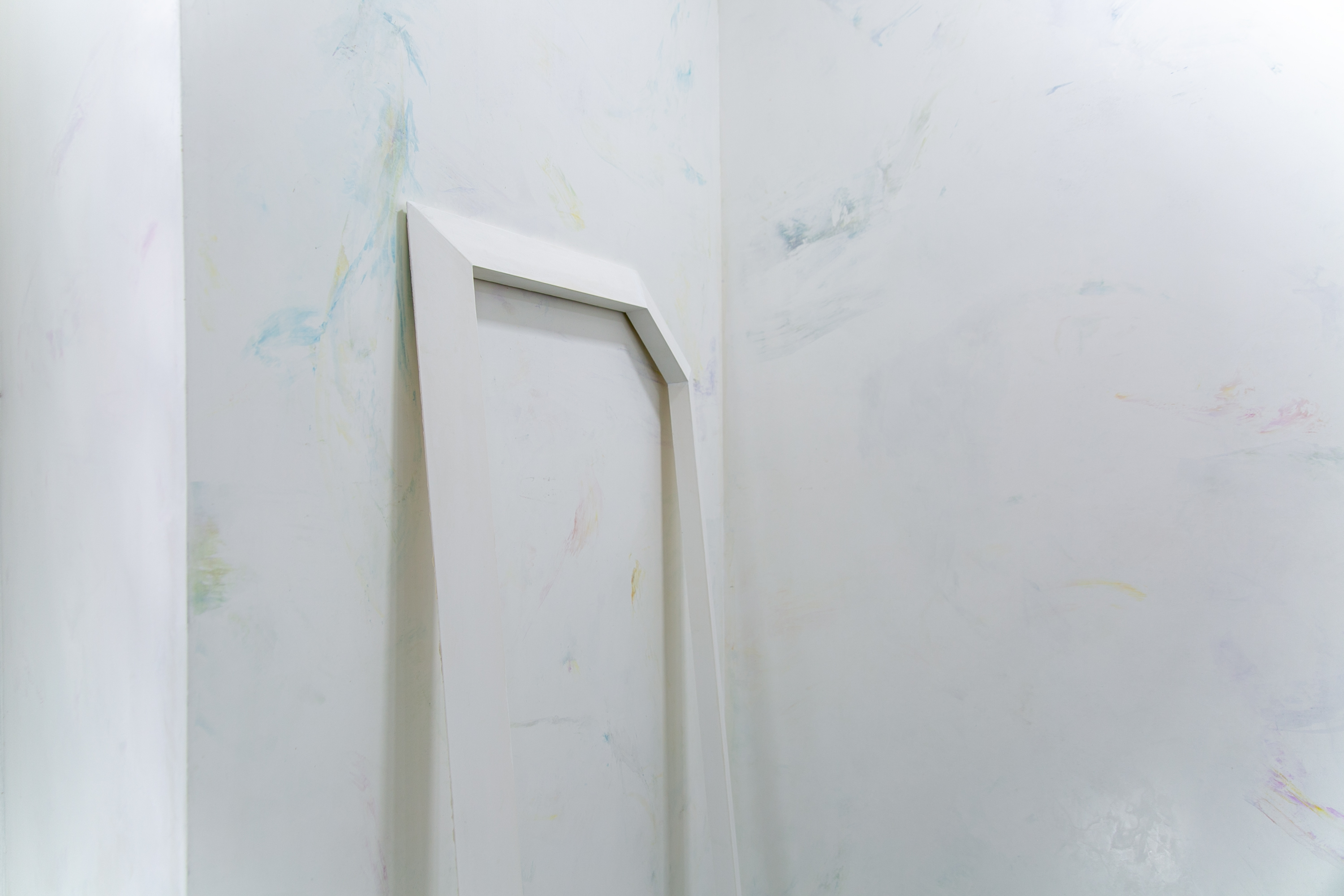 nūbēs by Raphaël Lecoquierre is an in-situ work in the form of an abstract fresco that stretches the length of the exhibition space. It was created from a collection of silver gelatin photographs found and then obliterated by an oxidation process. While the images dissolved, the artist extracted the coloured substances from them and incorporated the pigments into a stucco surface applied to the wall. The images documenting the world have disappeared and are renewed as interwoven abstract patterns on a nebular, ethereal pictorial surface.